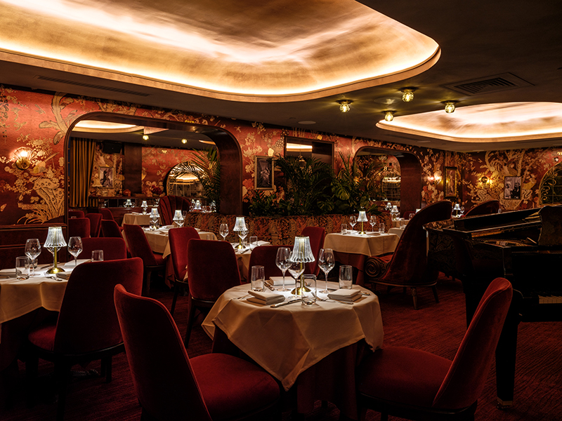 El interior del restaurante también merece una mención especial por su cuidado diseño y su elegancia atemporal. Distribuido en dos niveles, el piso principal recrea la atmósfera de una auténtica brasserie parisina, mientras que la planta superior alberga un refinado salón revestido en terciopelo rojo, evocando el glamour y la opulencia de la Belle Époque.